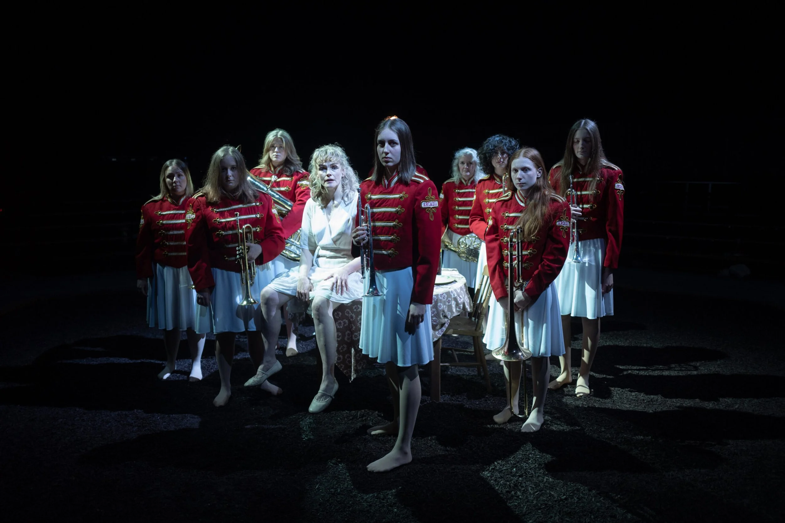 “There is a section played on headphones and, best of all, a brass band in virginal white skirts and blood-red tunics. They are otherworldly onlookers, their music, scored by Gazelle Twin, at once ancient, familiar and strange.” THE GUARDIAN